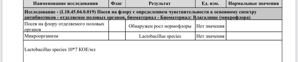 • Гинекологический посев на флору. В порядке, без отклонений- обнаружен рост НОРМОфлоры