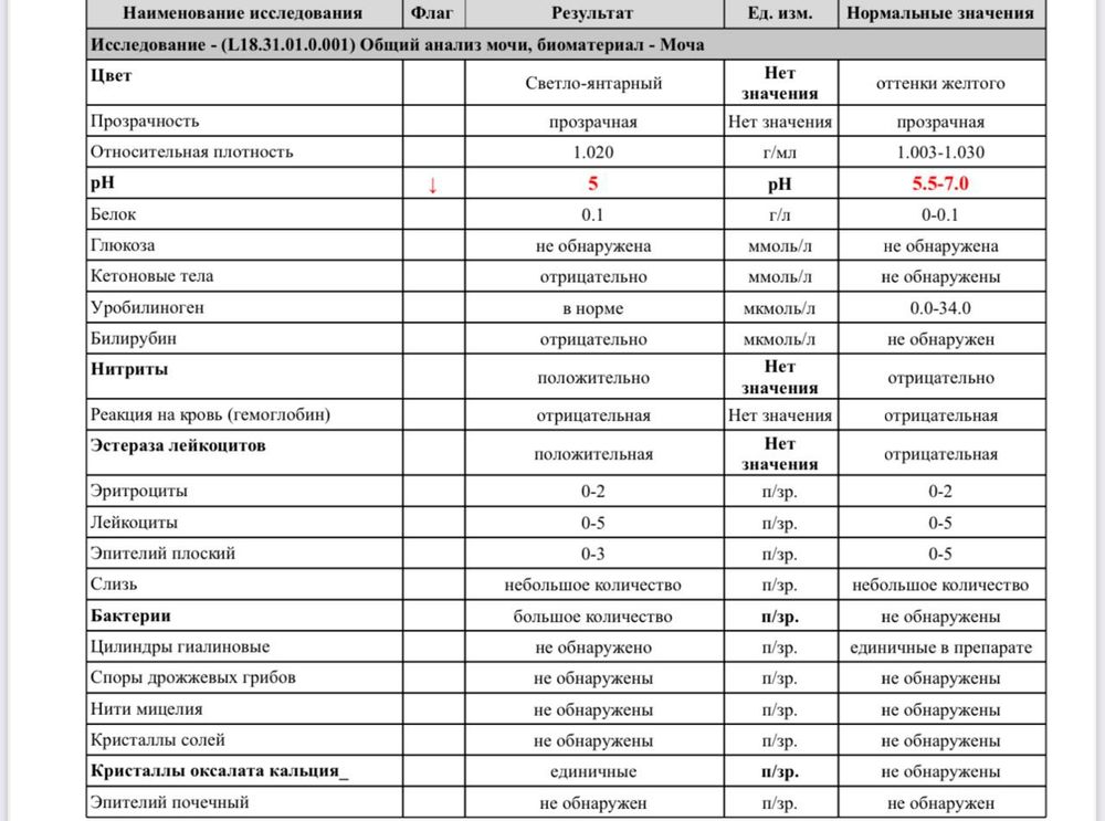• Общий анализ мочи. Пониженный pH, повышенные лейкоциты, бактерии в большом количестве, нитриты обнаружены