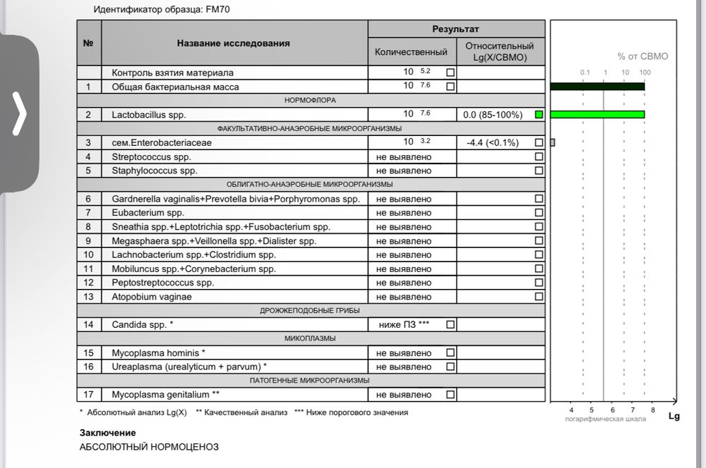 • Фемофлор. Все в порядке, без отклонений. Даже очень хорошо.