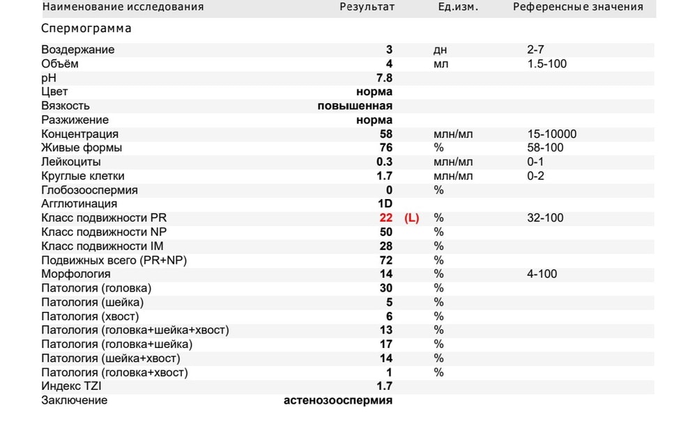 Алина Горева, там референсное значение 4-100. Это не по Крюгеру. По Крюгеру максимум - 19%, но в реф значении просто пишут ≥4. А спермограмма с морфологией по Крюгеру очень отличается от подобных спермограмм по ВОЗ и может оказаться далеко ненормальной. Расскажу наш случай: по ВОЗ было 30% (также были указаны все поломки), пересдали по Крюгеру - оказалось 2%