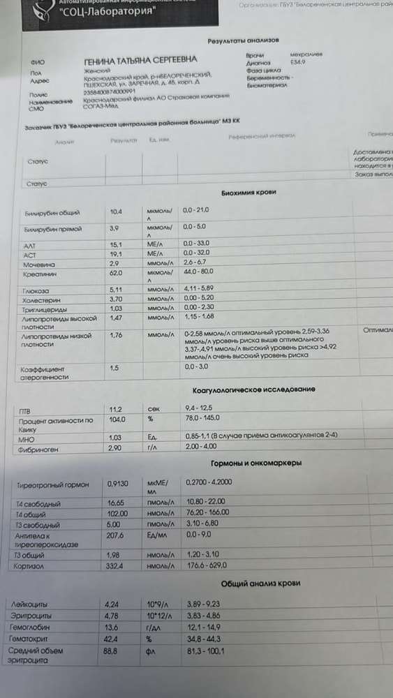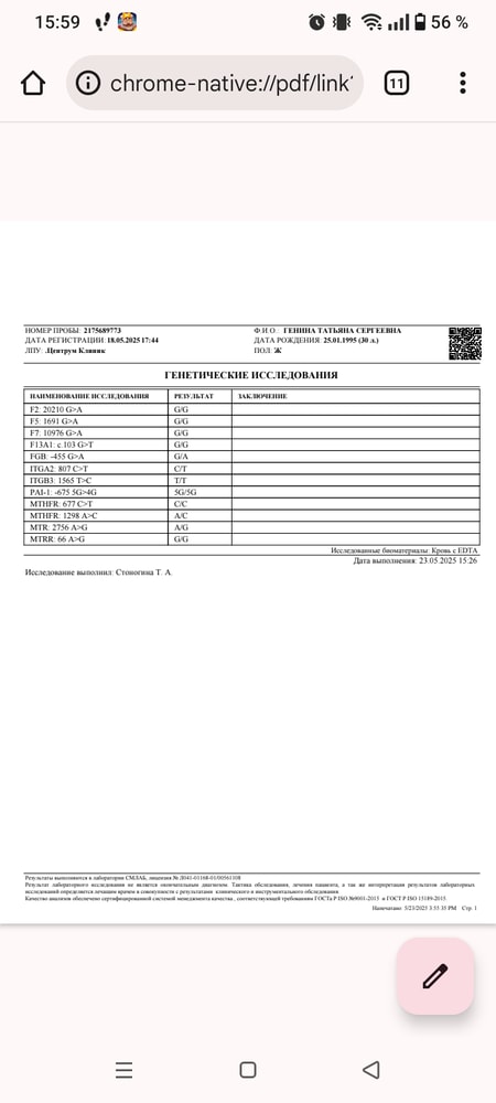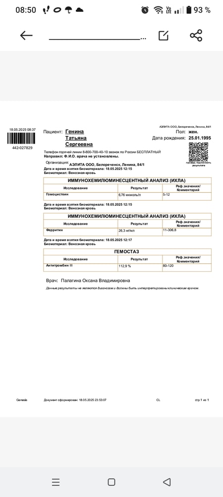 Татьяна , у меня низкое Железо и Ферритин всего 4. Но это я думаю после сильного кровотечения после МА. Три месяца пить препараты Железа. Остальные анализы у Гематолога в пределах нормы. У Генетика отклонения врождённые. Поставили врржденную Тромбофилию. Но сказали что если остальных детей выносила, то вряд ли кровь виновата. Но все таки назначили Клексан с первых полосок и сразу на прием к Гематологу.