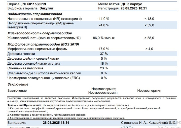 Валентина, они мотали видимо от того что не могли поверить. Морфология 17%, я такого еще не видела. Интересно посмотреть предыдущую спермограмму