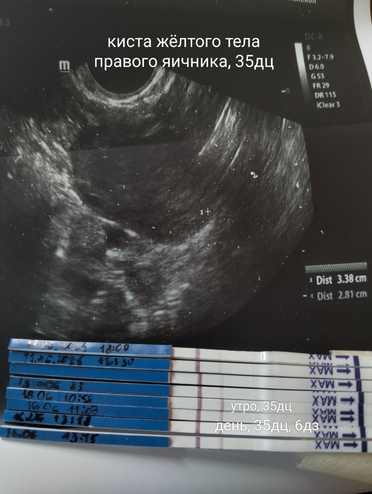 Сегодняшнее УЗИ и тесты, которые делала с первого дня задержки. Сегодня внезапно поярчали полоски.