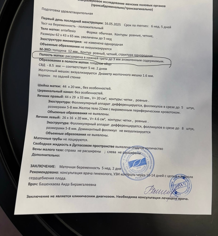 Так полость матки расширена за счёт того что у вас там плодное яйцо так и должно быть,а анэхогенное образование это и есть плодное яйцо,если что-то не так, то это выносят это в заключение,у вас все отлично,в заключении только срок стоит
