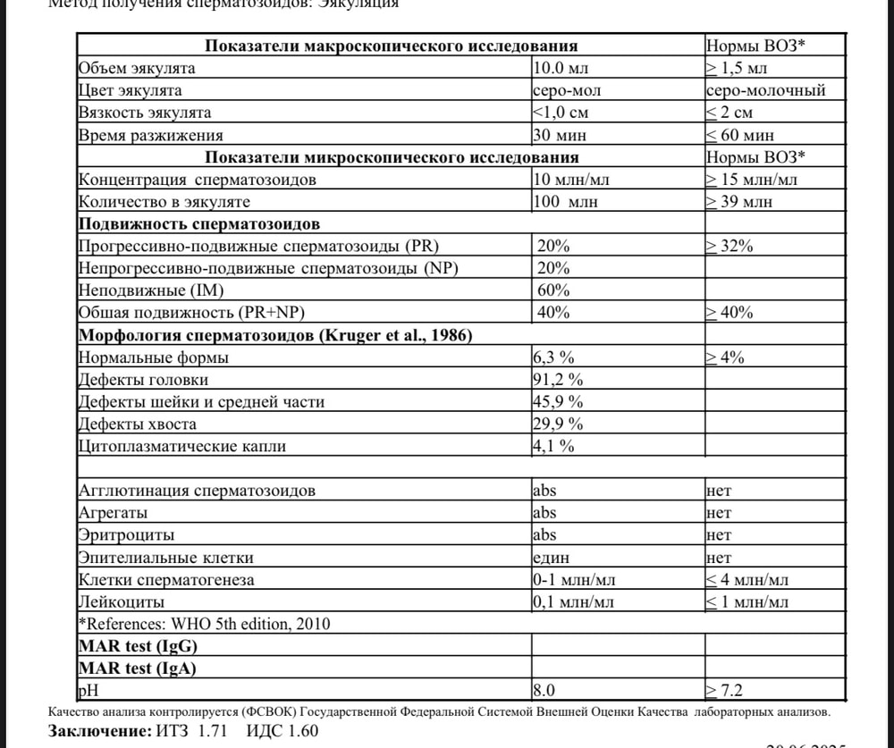 Концентрация в 1 мл низкая , но спасает объем, подвижность низкая . А вот с морфологией ( дефектами) все нормально.