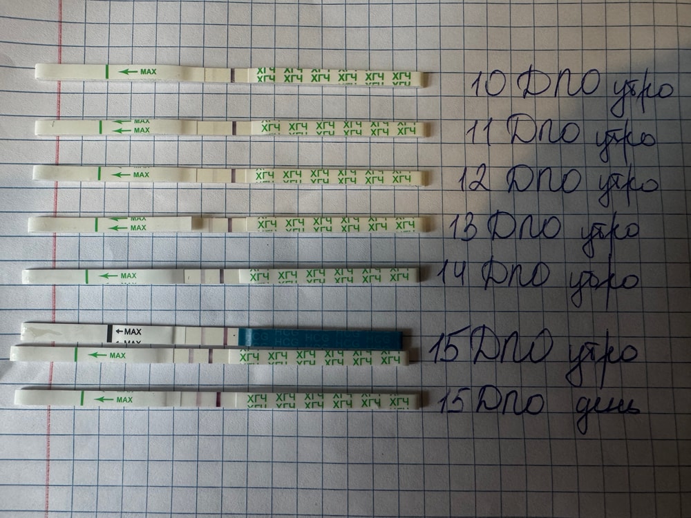 второй цикл планирования. 2й день задержки, тесты на 2м фото с 10дпо по 15дпо.