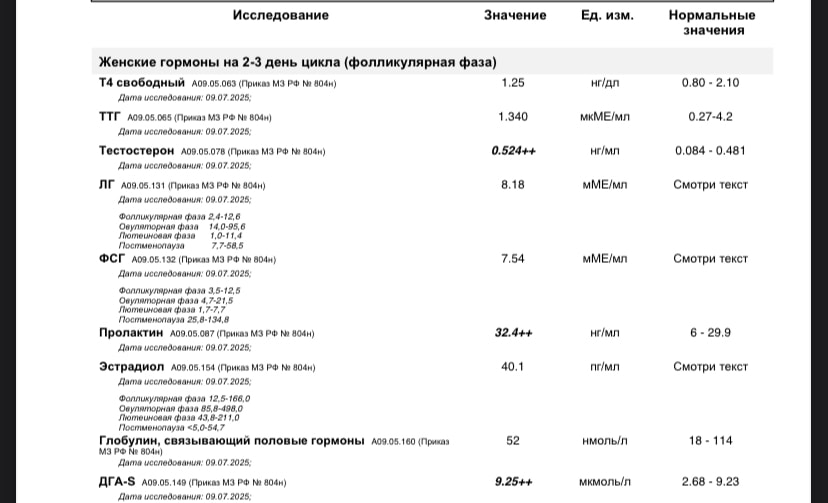 У вас тут есть и хорошие новости и не очень, начнем о хорошим у вас отличное соотношение фсг и лг и это очень хорошо) а вот мужской у вас гормон завышен и женский пролактин, к врачу вам нужно а лучше к эндокринологу, овуляция может не быть из-за повышенного Пролактина!!!! У меня тоже был повышен пила 4 месяца достенекст на 4 месяц забеременела дочкой)