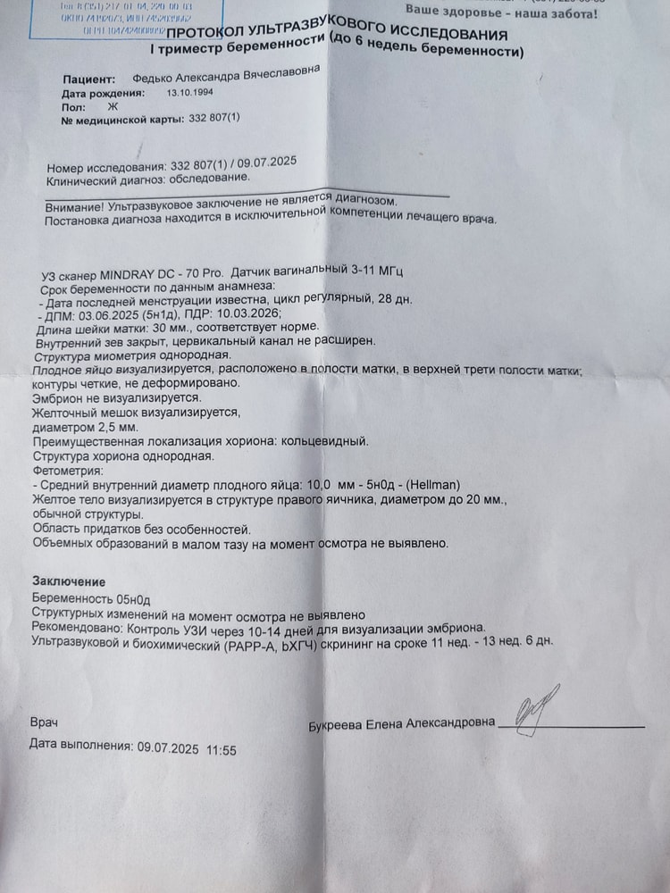 УЗИДобрый день. Сегодня ровно 5 недель и 7 дней. УЗИ первое делала 09.07.25. Если я пойду на УЗИ сегодня будет ли виден эмбрион уже или еще нет? Очень переживаю, начиталась тут про анаэмбрионию и все, теперь переживаю как и что с ним. Еще все говорят если нет токсикоза то плохо, а у меня его пока нет, так иногда чуть чуть подташнивает, но терпимо.