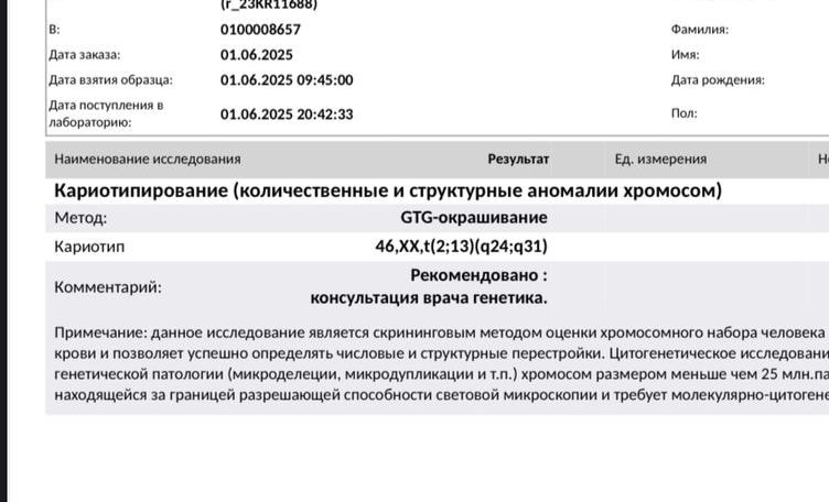 АнализыПривет! Ищу девочек с похожей ситуацией — носительниц сбалансированной транслокации.У меня кариотип 46,XX,t(2;13)(q24;q31).Была неудачная беременность (анэмбриония), пустили в протокол без консультации генетика. Сейчас хочу разобраться, как лучше действовать дальше: пробовать самостоятельно хочу, не хочу донорскую яицеклеткуЕсли у кого-то был похожий путь — поделитесь, пожалуйста, своим опытом.Удалось ли забеременеть и выносить?Очень нужны поддержка и реальные истории. Спасибо!