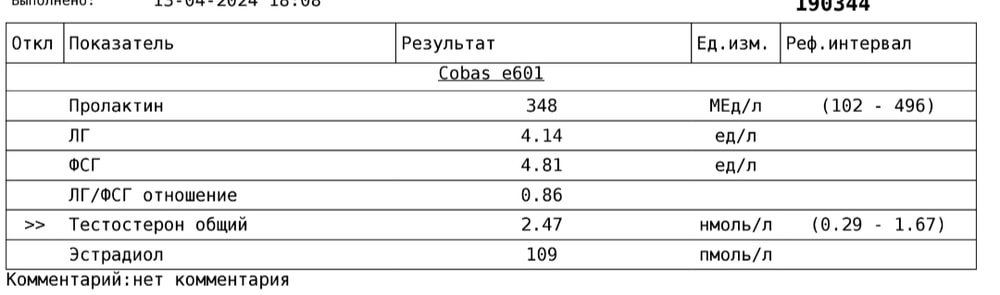 Здравствуйте. У вас вес в порядке ? При большом весе бывает мфя + у вас повышен тестостерон. Даже такое незначительное повышение влияет. ЛГ и ФСГ у них по- моему должна быть разница в соотношении а не одинаковый показатель.