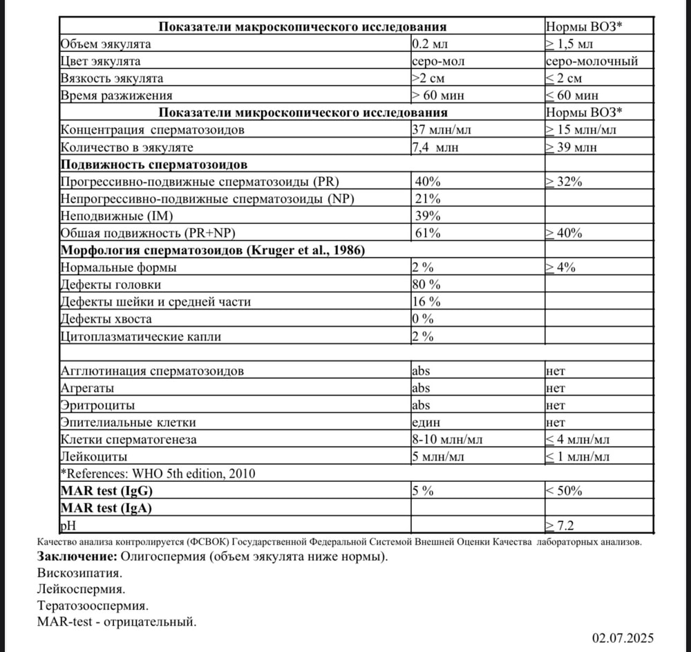 Мы планируем уже 7-8 месяцев. Сейчас решили, чтобы муж сдал спермограмму. Первый раз пошел сдавать в клинику и из-за стресса не получилось хорошо сдать, было мало жидкости для анализа. С этим результатом сходили к андрологу. Он оценил результат, как недействительный из-за объема в 0,2 мл. Сказал пересдавать на дому и привезти в другую клинику где он так же работает. По второй сдаче сказал, что все хорошо. Но меня очень смущают результаты и отношения врача в данном плане. Когда меня проверяли мне первый врач попался не очень хороший, который просто выкачал много денег на различные бесполезные анализы) И все обязательно в их клинике) Поэтому теперь переживаю, что врач ответил некомпетентно.