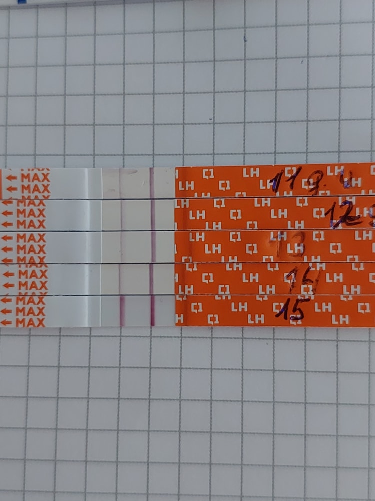Ну а что толку от тестов,если даже одинаковые полоски будут,они же не показывают овуляцию,а что будет лопать если нет по УЗИ ДФ ? У меня в ановуляторный цикл весь цикл вот такие как ваш нижний был,ярче контрольной так и не стали, овуляции не было,так как ничего не выросло