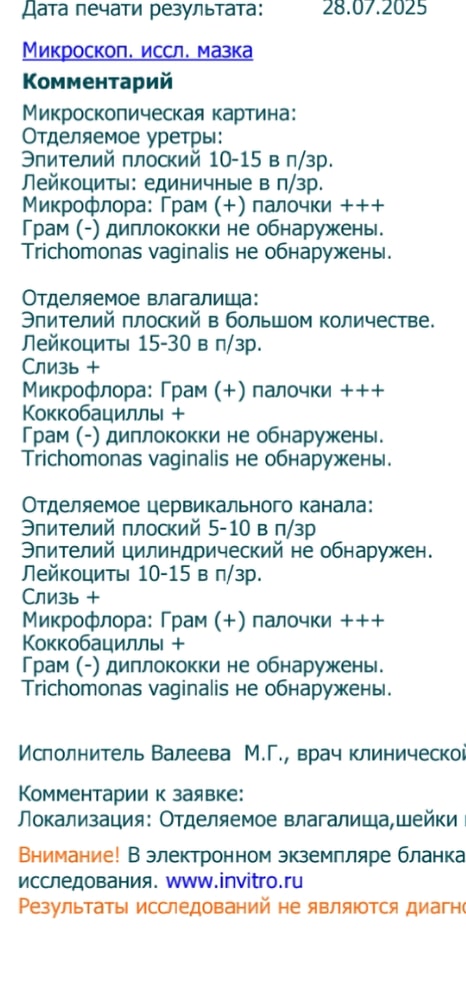Влагалище - лейкоциты немного выше нормы, должно быть до 10 (возможно, что небольшое воспаление, микротравма, колебание гормонов).