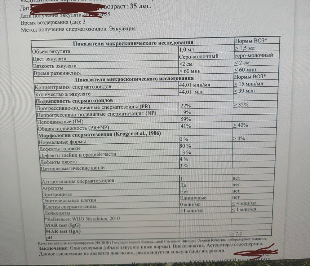 сг /анализы/ обследования для мужчинВсем привет, планируем с мужем ребенка уже год. Не получается забеременеть по сей день. Я прошла обследование, нашли полип эндометрия, удалили в январе 25г, врач отправил на естественную беременность. Недавно сдали спермограмму, нашли 0% морфологию нормальных форм по крюгеру , дефект головки 80%.