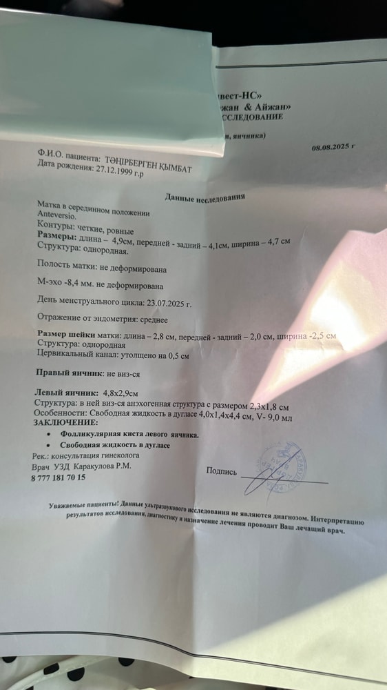 Я сходила уже другому узисту, так как прошлая сегодня не работает оказывается… И знаете что этот узистка сказала? что никакой О не было, киста фолликулярная! жидкость позади матки 9 мл, и какой-то образование рядом с мочевым