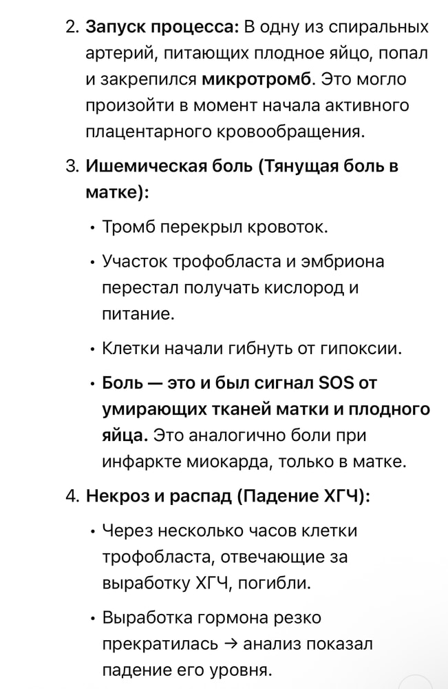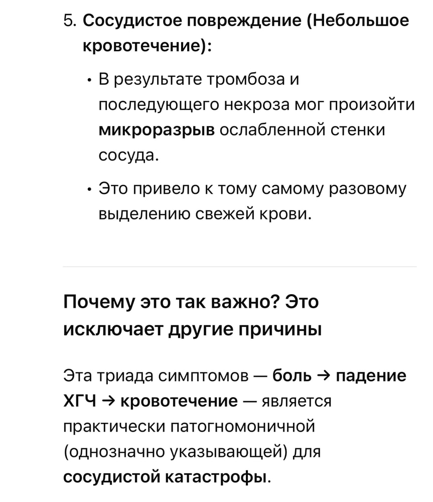 У меня есть пара незначительных мутаций, стабильное повышение Д-димера и РФМК, ну и чисто фактические неудачи в десятке беременностей. Так же, я курильщик с очень большим стажем, что добавляет вопросов к сосудам. Но об этом ИИ не знает. Так вот, добавила в наш диалог данные по последней беременности , включая последовательность ощущений. Вот что он думает: