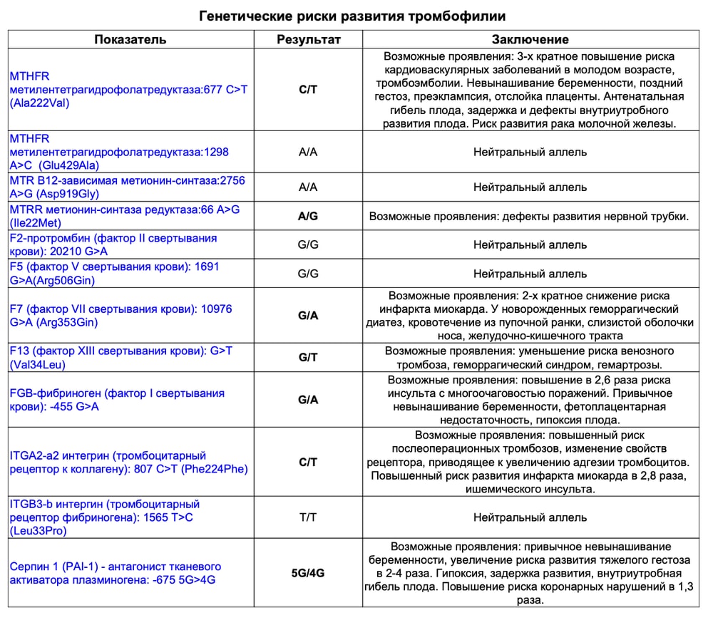 АнализыДобрый день! После двух прерываний беременности потихоньку начинаю разбираться почему такое произошло 2 раза подряд (первая замершая, вторая триплодия (69XXY). Была на приеме у гинеколога, она посоветовала сдать анализы на афс, нарушения фолатного цикла и тромфофилию. Пока сдала анализ только на ген.риски развития тромбофилии. Пришел результат...Мутаций много, а как прочитала заключение, то очень испугалась, много где написано, что невынашивание, дефекты нервной трубки плода и т.д. Планирую сходить к генетику после сдачи всех анализов, но уже хочется узнать. Может быть кто-то сталкивался с подобным, можете объяснить насколько все это плохо?