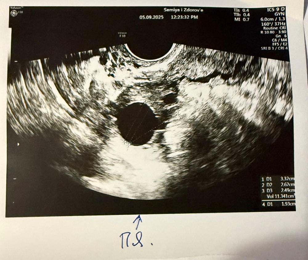 29.08. (9 ДЦ), яичники увеличены, около 16 см3 оба, ХГЧ ещё в остатке, эндометрий 4,5 мм. Фолликул в ПЯ 8,5 мм, в ЛЯ до 6 мм.