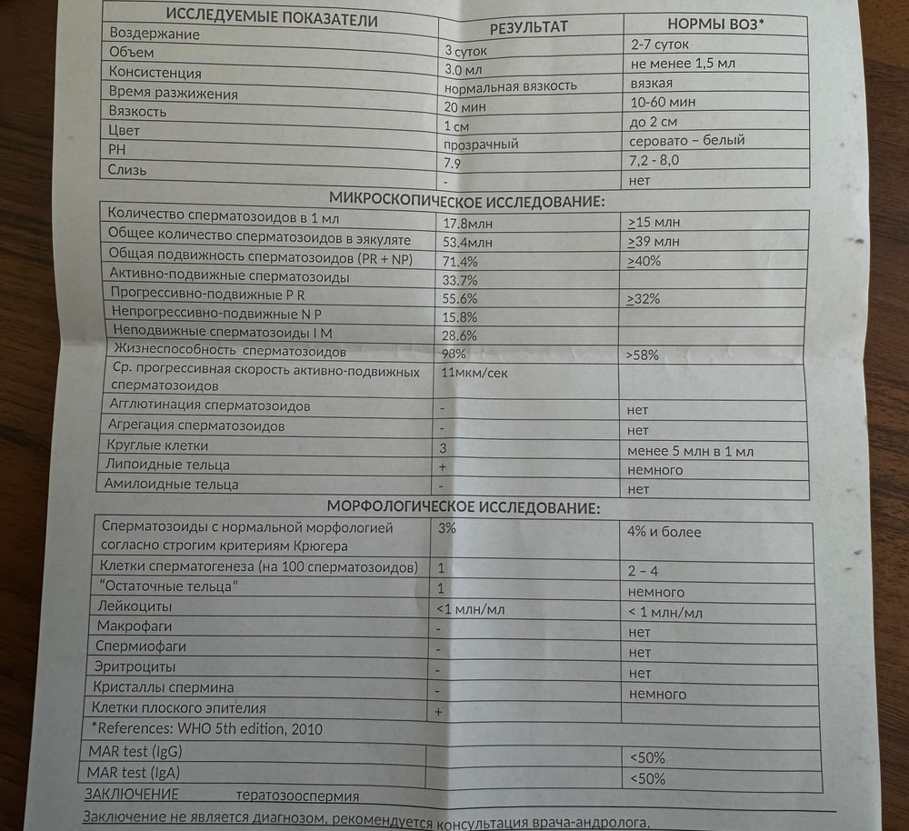 Подскажите пожалуйста, возможно ли забеременеть с такой спермограммой? У кого-нибудь были похожие ситуации? Что прописывали?