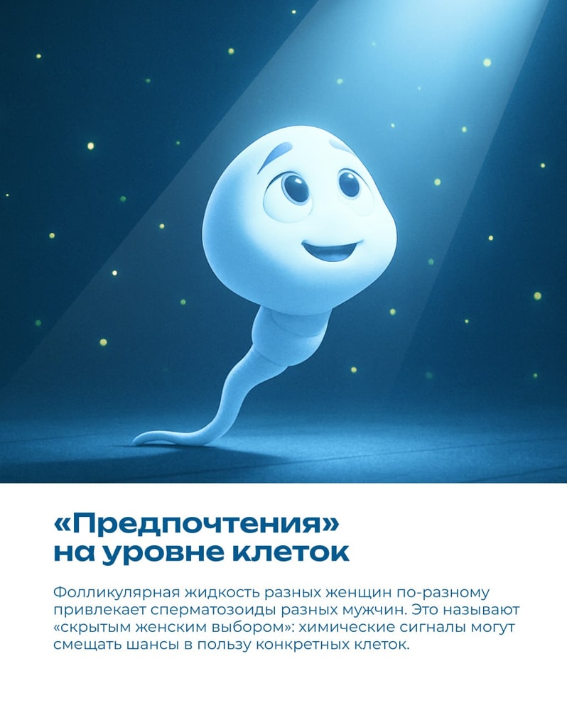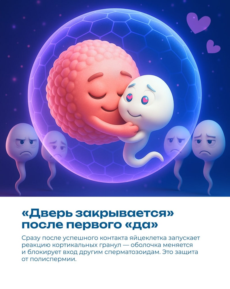 статистикаНе «самый быстрый победил». На пути к яйцеклетке включаются фильтры женского организма, химические подсказки и система «замок–ключ». Сперматозоиду мало добраться — он должен подойти по «паролю», а после первого успешного контакта дверь для остальных закрывается. Так природа устраивает тонкий отбор на клеточном уровне — не гонка, а согласованность.