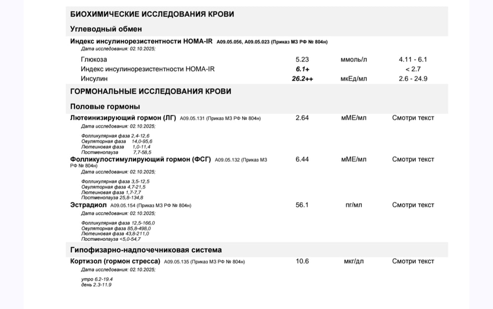 А индекс массы тела повышен ? Да из за инсулина может не наступать беременность . Пролактин не сдавали ?