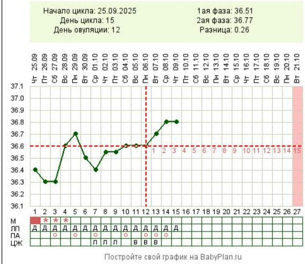 Базальная температура, ТТ, графики БТСегодня на 15 дмц утром поставила в таблицу температуру 36.8 и график выдал, что овуляция была на 12 дц, без понижения температуры перед подъёмом. Последние 3 месяца О была с 13 на 14 дц, подтверждала по узи. Такая вот картина прорисовывается, сегодня начала принимать поддержку дюфастон 2 т в день, утро и вечер. Обычно принимаю с 16 по 25 дц, как прописала Г.