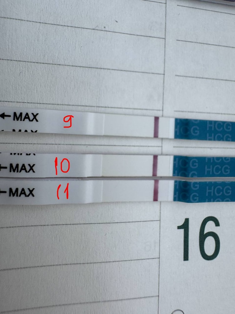 История следующая: делаю тесты утром с 9 дпо, по времени 3-5 минут и все кристально чистые. Правда вчера, на 10дпо, в другом приложении девочки что-то разглядели, но я считаю это тень и камера айфона с ее "улучшением". Но это меня взбудоражило и я побежала в мусорку! Кажется, и я что-то увидела! прилепила в блокнот для отслеживания...