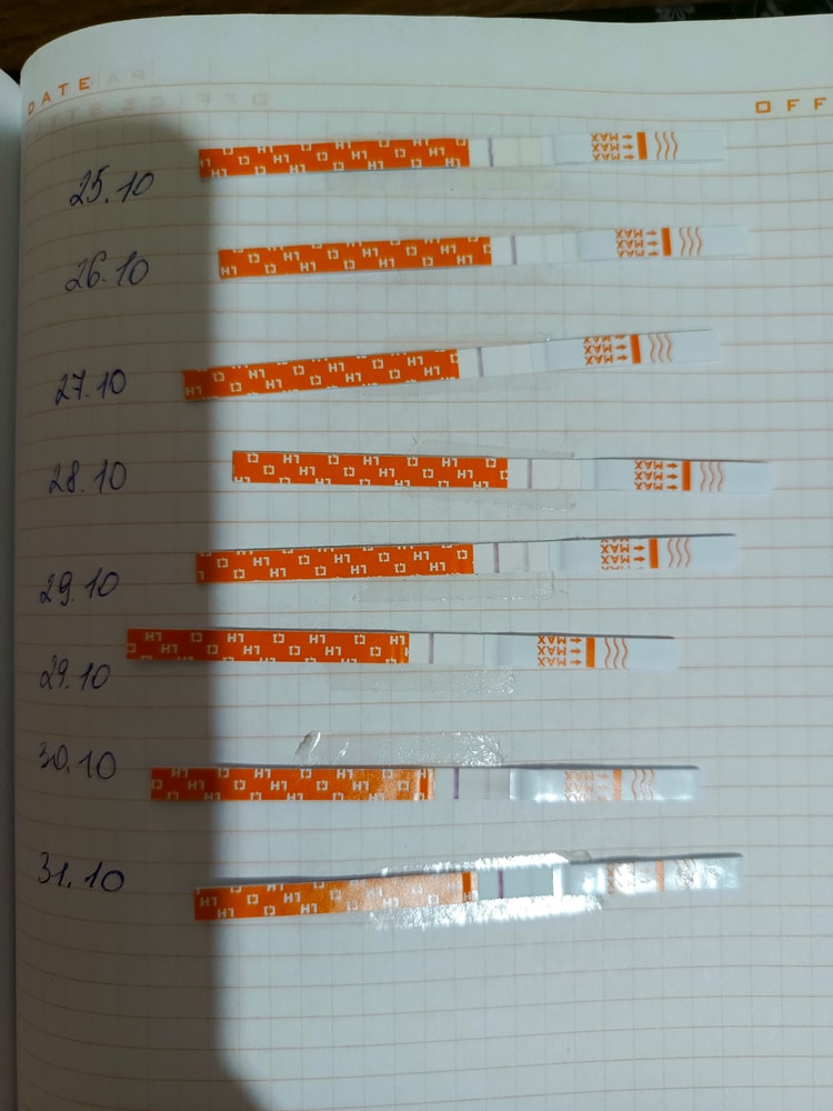 Овуляция( тесты на овуляцию)Девочки, с тестами на о имею дело впервые. Посмотрите, пожалуйста, могла ли я пропустить пик между 28 и 29 числами? Это 12 и 13 дц.