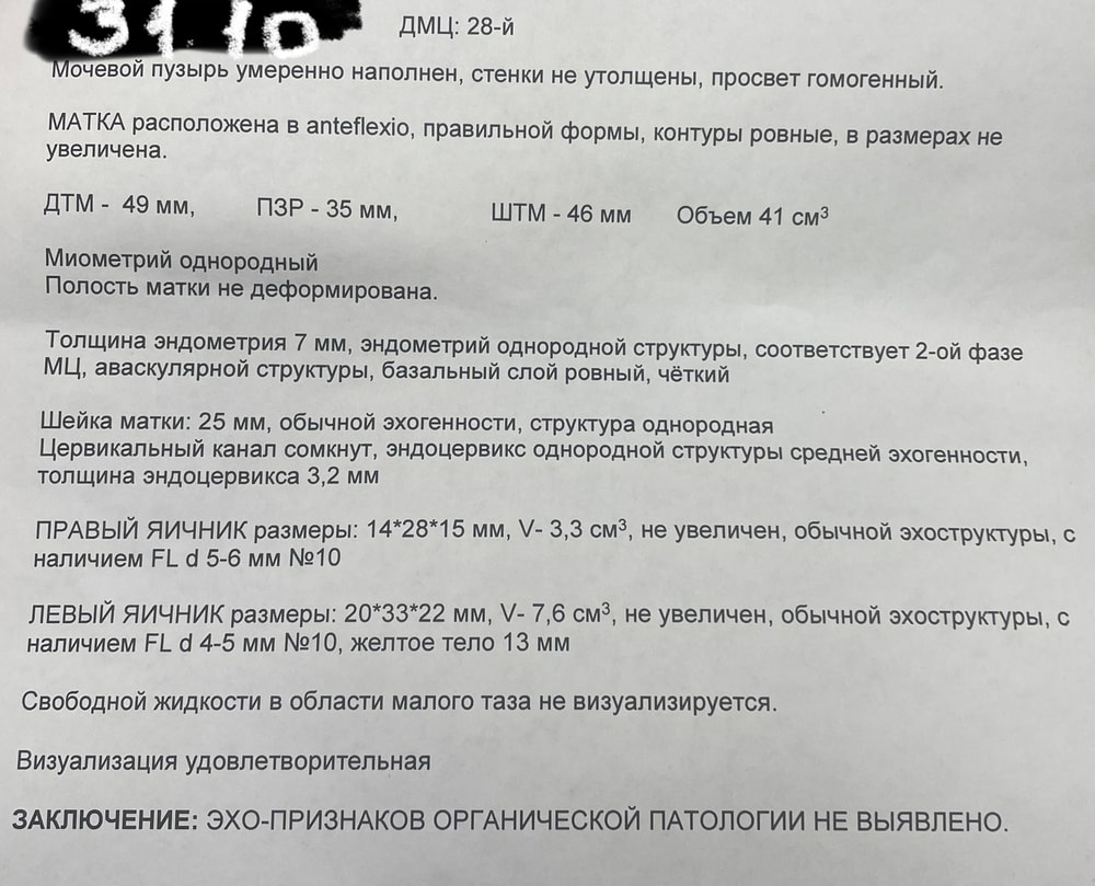 УЗИДобрый день, мы с мужем планируем беременность и в этом месяце произошло что то странное… дата начала последней менструации 4 октября закончилась 8, овуляцию отслеживала всю неделю почти сначала были бледные еле заметные полоски, 23 октября жирные четкие полоски, 24 октября стала чуть бледнее но яркая, вообщем положительный ещё был, с 25 числа тест уже отрицательный, через день после овуляции 26 числа стала странно себя чувствовать и во время овуляции болел живот то справа то с лева и поясница, так через день после начали болеть соски грудь вообще не болела, живот то болит то нет и с поясницей также, позже появилась небольшая изжога, нога немеет правая не знаю с чем связано), все это началось за 2 недели до месячных в середине цикла скажем так 29 числа пошла на узи спустя 6 дней грубо говоря гиня сказала что у меня была очень хорошая овуляция, что её признаки сохраняются до сих пор так скажем, желтое тело СПРАВО 20 мм, мои симптомы и все это очень похоже на беременность сказали большая вероятность, я очень была рада и надеялась, после узи появились выделения с комочками, до этого были просто густые белые выделения, утром тоже самое, пошла опять к гинекологу она сказала это может быть при ранец беременности сказала какие свечи купить, вечером я попала в не большое ДТП, удар был в поясницу и копчик, живот начал тянуть и поясница сильно болеть, начала болеть сама грудь помимо сосков, живот прошел относительно быстро, а вот поясница ломит до сих пор, решила сходить ещё раз на узи очень испугалась, на узи я пошла 31 через два дня после предыдущего и уже к другому гинекологу, моя на больничном, она сказала, что у меня отсутствуют даже косвенные признаки беременности и желтое тело с ЛЕВО А НЕ С ПРАВО, я не понимаю как такое может быть, очень расстроилась и совсем забыла про фото узи, она мне его не дала только заключение и как выяснилось уже не дадут оно не сохранилось, сказали переделывать, я очень доверяю своему гинекологу, но по заключению второго врача о беременности не может быть и речи в этом цикле, я не понимаю как желтое тело оказалось с лево если оно точно было справа в этом я уверена, а вторая врач уверяет во Братном, живот в обуляцию хоть и болел с двух сторон но больше справа помойму, вообщем я не понимаю есть ли шанс что я беременна или все таки нет, я понимаю что это слишком рано, до задержки ещё 4 дня, но мне плохо уже неделю по симптомам даже больше это же не просто так, я прикреплю фото заключения, могу ли я быть беременна, если посмотреть на эти заключения хотябы, подскажите пожалуйста фото узи относятся к 29.10, без фото 31.10