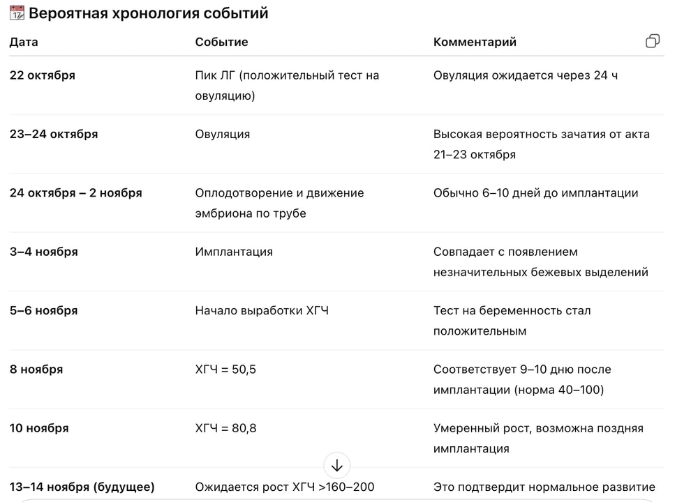 С последующего дня тесты уже бледнели. На основании этого - я и сделала вывод, что овуляция была 23.10. Но что если овуляция состоялась 24-25.10. И если прикинуть, что имплантация была поздней - то есть, заняла 10 дней, то произошла она 3-4.11. Началась выработка ХГЧ, и как раз 6.11 тест на беременность заполосил, а 7.11 - показал ХГЧ 50,5 вроде как и не так уж мало...