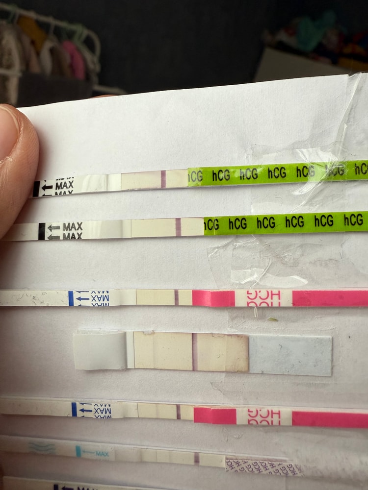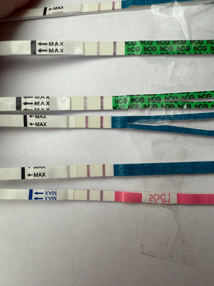 Вторая бер.планировалась тоже. Через год после кс, я так и думала , потому что возраст уже 37, пояснять не буду почему все так поздно, да и не важно это. Начали с сентября, отследила овуляцию по тестам и по микроскопу определения овуляции по слюне. Пролет…Почему то овуляция пришла аж на 25 дц. Я подумала сбой гормональный по ходу, сдала все анализы для тех кто планирует. Все гормоны в гемотесте есть чек ап на это. Все отлично. Видимо какое то единовременное явление. На октябрь 2025 тоже отслеживала тестами овуляцию, пришла примерно на 16/17 дц. Как только тесты стали яркими, начали усердно планировать. Считаю ДПО после 17дц. На 7ДПО сделала тест , не сдержалась, мой глаз уловил еле еле еле заметную , можно сказать незаметную вовсе полоску. На 9ДПО (3.11) пришла какая то мазня светло бежевая, сделала тест, глаз уловил уже более похожую на правду полоску. Все покажу ниже. Мазня началась коричневая темная к 10дпо. Мазало с 9 по 14 дпо, даже иногда проводя бумагой , обнаруживала розово-красную кровь на ней , в нормальном таком количестве, но она не текла. Я испугалась, побежала на хгч на 12 Дпо, пришло хгч 70+, пересдала через 48ч - 128+.