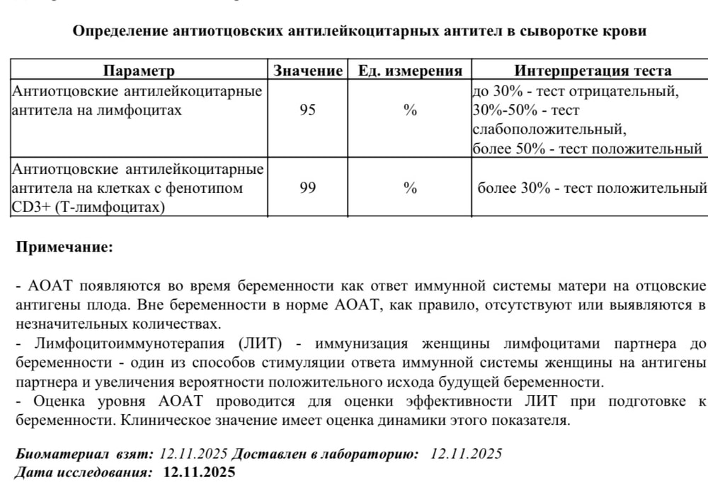 За 2 курса ЛИТ в стандартной дозировке лимфоцитов и контроль эффективности (антиотцовских антител и субпопуляционный состав лимфоцитов) отдали около 30 т р