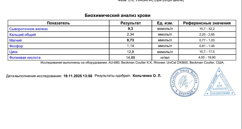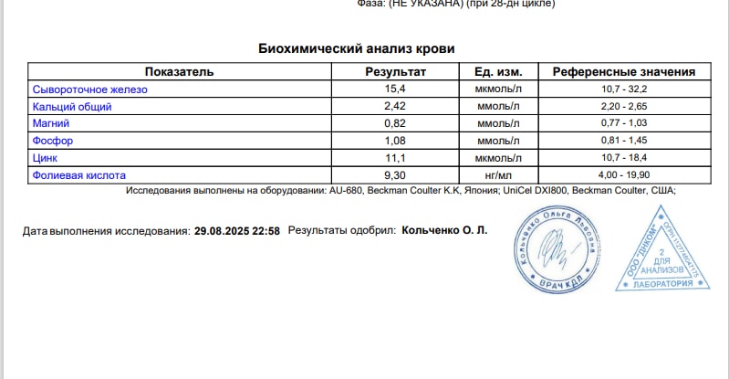 Что имели на старте? Анализы от 29 августа 2025, по которым был выявлен дефицит витамина Д, а также цинк на нижней границе. Не фонтан были также магний и железо, но их не пила еще, спойлер - зря не пила, они еще упали.