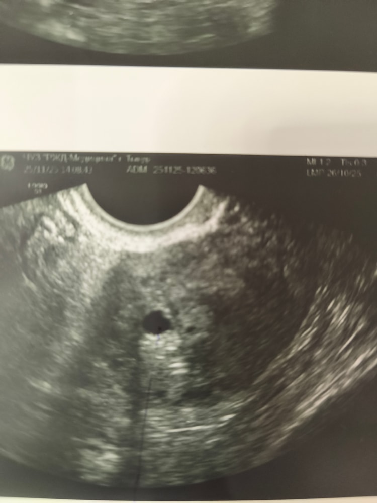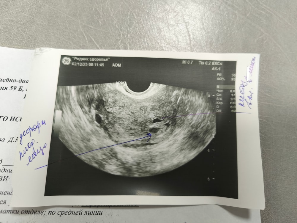Беременность- 1 триместр ( только до 10 недель)В первый день задержки якобы увидели пя, на узи пошла так как были бежевые выделения. В первый день задержки пя 4,5 мм, я очень сильно сомневаюсь что это было оно, так как овуляцию отслеживала по узи и была 10.11.25 а узи 24.11.25. Сегодня повторила через неделю, срок по месячным 5,2 н.пя 6,5мм деформация ,не выросло практически , отправляют на чистку нет желточного мешочка.Сравнивают с первым узи, но разные клиники. Прекреплю снимки. У меня аденомиоз. Могли первый раз перепутать, так они даже находятся в разных проекциях. Первый снимок в день задержки, ниже от сегодняшнего дня