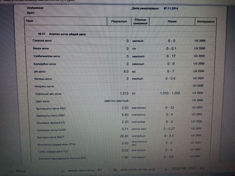 была темп в теч 4 дней 38-39,жидкий стул. в моче лейкоциты, бактерии. в анализе были лейкоциты сплошь. больше никаких исследований не проводили. пили амоксиклав. стало получше на 1 месяц. потом анализ снова такой же стал. высылаю анализ второго обострения (в сентябре) .пили фурагин. попали в инфекционку — и там еще 2 антибиотика пили. при выписке моча была хорошей.