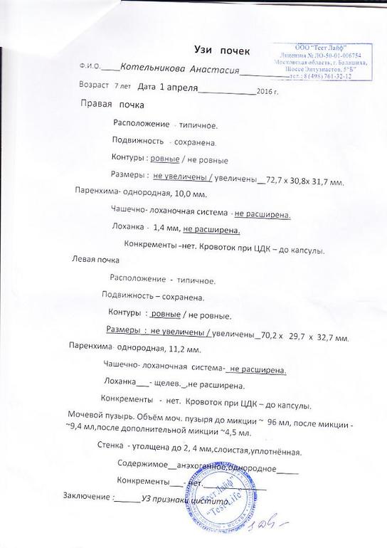 Ходили к остеопату (2016г), сняли "зажимы в области крестца" (была хлыстовая травма на детской площадке в 5 лет), но остеопат сказала, что проблема в неврологии, посоветовала обратится к гомеопату, к неврологу сказали, что не надо т.к. назначат сильную терапию ("пушкой по воробьям"), которая нам не нужна С неврологией проблем у дочки не было даже в младенчестве. Делали УЗИ почек и мочевого (фото прилагаю), сказали, что почки в идеале, а вот в мочевом утолщение стенки, поставили подозрение на цистит (хотя у дочки никаких жалоб не было), назначили посев мочи на флору (ничего не обнаружено) и посоветовали обратится к урологу.
