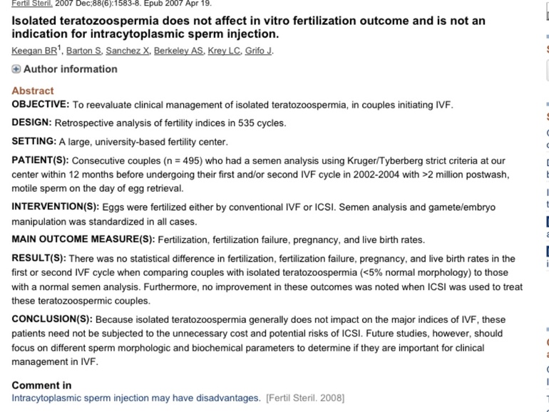 Максим Викторович, спасибо за статью! Кое-что прояснилось. Я так понимаю, что 4% - это нижняя граница и для ЕБ, и для ЭКО, и для ИИ. Чем выше этот показатель, тем лучше, а после 14% шансы на зачатие не увеличиваются. И зачатие напрямую зависит от морфологии. Хотя я читала вот такое исследование 2007, в котором говориться, что изолированная тератоспермия (при всех остальных нормальных показателях) не влияет на успех ЭКО. Видимо, мнения все-таки расходиться у разных ученых.