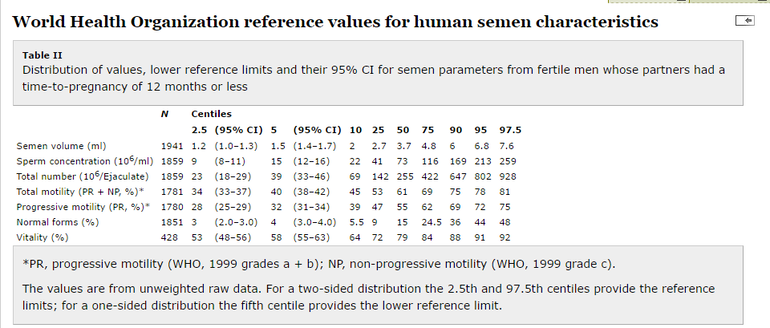 Не могли бы Вы еще раз внести ясность по поводу норм спермограммы ВОЗ 2010 года. Одни пишут, что этого достаточно для естественной беременности, другие отправляют на ЭКО. Не найдя внятного ответа в русскоязычных источниках, как эти нормы были получены и для чего они годятся, я стала читать английские статьи и столкнулась вот с такой табличкой.