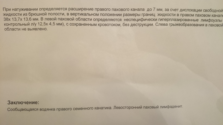 Сегодня сделали УЗИ: Сообщающаяся водянка семенного канатика. Левосторонний паховый лимфаденит
