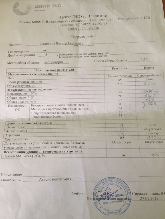 История у нас такая, мы с мужем в браке 12 лет, и в этом браке было 2 беременности, одна 12 лет назад, но она закончилась выкидышем на 5 неделе и вторая 11 лет назад, которая закончилась родами, тоесть у на один ребенок есть, сейчас планируем второго, планируем уже около двух лет, себя конечно же обследовала в первую очередь, женский фактор исключен, после себя занялись мужем, последние две спермограммы делали в клиниках, спец. на ЭКО, ходили на консультацию с урологом, но тот сказал что все у него отлично, потом пошли к андрологу, который назначил, анализы, которые я предоставлю, сделал узи! и все- как бы все в норме, назначил профертил на 3 месяца и здоровый образ жизни, и велел через пару месяцев еще раз сдать спермограмму! Вот я и пытаюсь выяснить, так как считаю что показатели обеих спермограмм очень плохие! анализы прилагаю, это гормоны, предпоследняя спермограмма, мазок на ПЦР,и посев