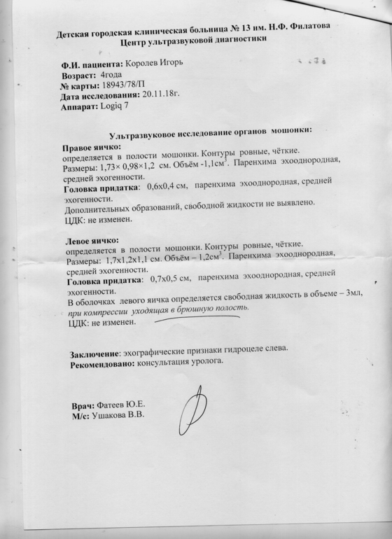 К сожалению это заключение не дает представления о проблеме. Должны быть конкретные цифры, объем яичка такой, объем водянки такой, скорость кровотока такая, просвет вагинального отростка брюшины есть-нет, если есть сколько мм, водянка - сообщающаяся, изолированная, комбинированная