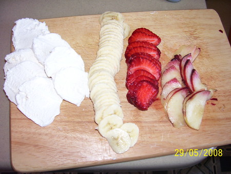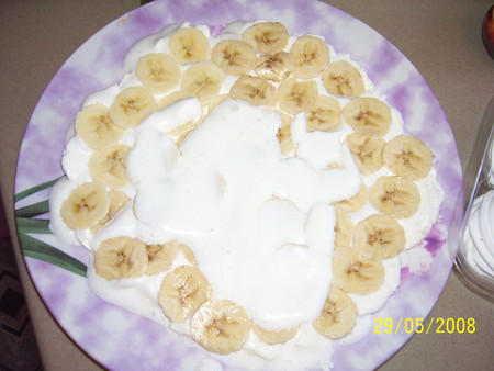 Выкладывать в блюдо слоями: зефир, помазать взбитыми сливками, положить бананы, помазать взбитыми сливками, потом опять зефир и т.д. чередуя в слоях фрукты и ягоды (если прослойка из клюквы, то посыпать сахаром).