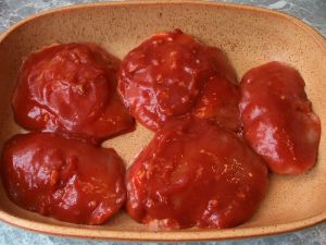 Смешать томатную пасту с выдавленным через чеснокодавку чесноком, посолить, поперчить. Кусочки мяса (толщиной около 2 см) обвалять в томатном соусе. Выложить на противень, поставить в духовку. Жарить при температуре 180 градусов в течение 30 минут.