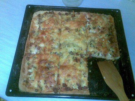 Затем влить содержимое из первой мисочки во вторую, перемешать. Добавлять муку (точно не могу сказать сколько, т.к. сама добавляла "на глаз") до такого состояния теста, пока оно будет совсем чуть-чуть прилипать к рукам. Получившееся тесто разделить на 2 части, т.к. из данного количества у меня получилось 2 противня или 2 пиццы. Раскатать по размеру противня. Противень смазать растительным маслом, сверху посыпать панировочными сухарями. Выложить тесто и растянуть. Поставить противень на слегка разогретую духовку (чтобы тесто чуть поднялось). В это время нарезаем начинку любую, у меня была такая: соус (смесь из майонеза, кетчупа и чеснока), колбаса 2-ух видов, яйца (отдельно на мелкой терке натирала желтки и белки), лук, соленые огурцы, сыр. На противень выкладывала в таком порядке: соус, лук, огурцы, яичные белки, колбасы, желтки, майонез (сверху нужно полить) и в духовку при температуре 180 градусов до полуготовности. Затем посыпать пиццу сыром и поставить еще на 5 мин. в духовку до образования золотистой корочки!