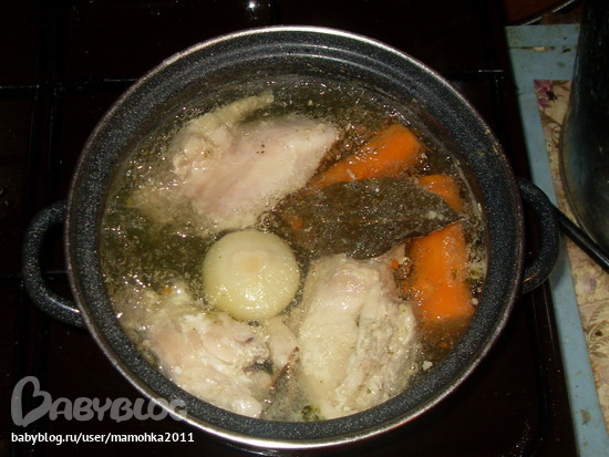 Варим курицу,морковь и лук(солим,специи по вкусу)