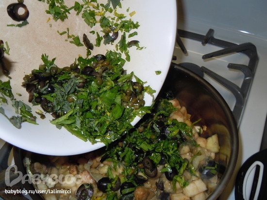 Снять с огня и добавить петрушку, шалфей, каперсы, оливки, перец.