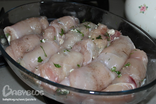 Грудку разрезаем вдоль на 2 половинки, отбиваем солим и перчим, выкладываем начинку и заворачиваем в рулетики