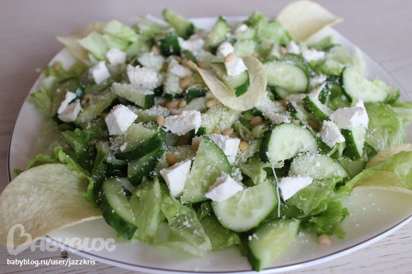 салаты никогда не заправляю, чтобы они могли дольше хранится, каждый сам себе выбирает заправку (оливковое масло, бальзамический уксус или крем, майонез)
