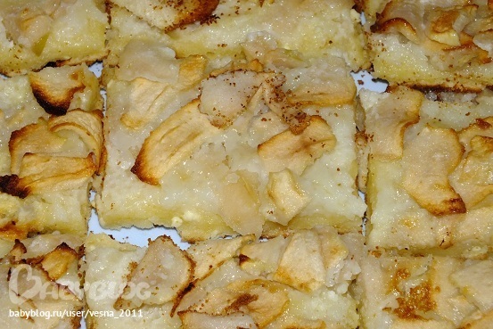 Выкладываем творожную массу сверху, разравнивая ложкой по всему периметру. Сверху на творожную массу выкладываем порезанные (и предварительно очищенные от кожуры) тонкими ломтиками яблоки.