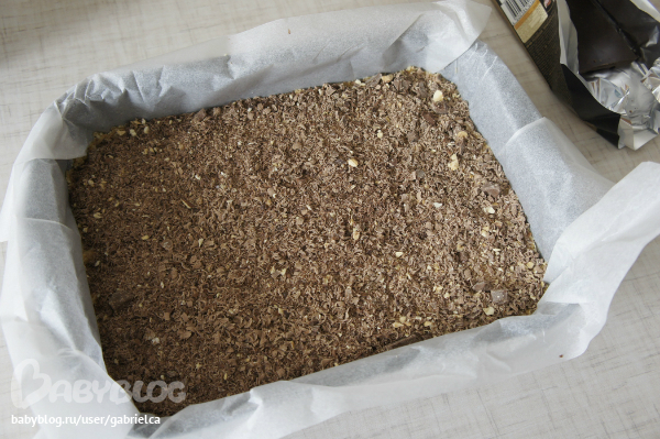 форму застелила пекарской бумагой и выложила в нее смесь , плотно утрамбовала